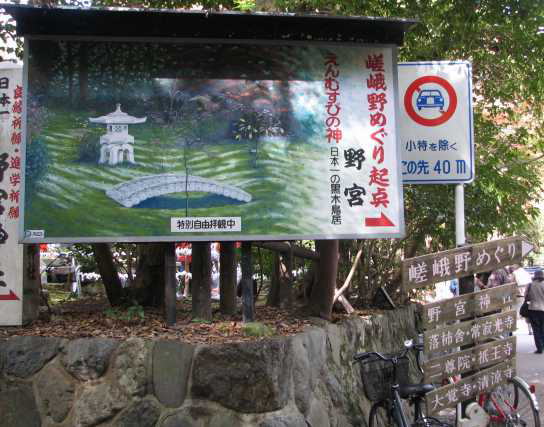 嵯峨野めぐり起点、野宮(ののみや)神社です。 えんむすびの神、進学祈願、黒木鳥居などと書いてあります。